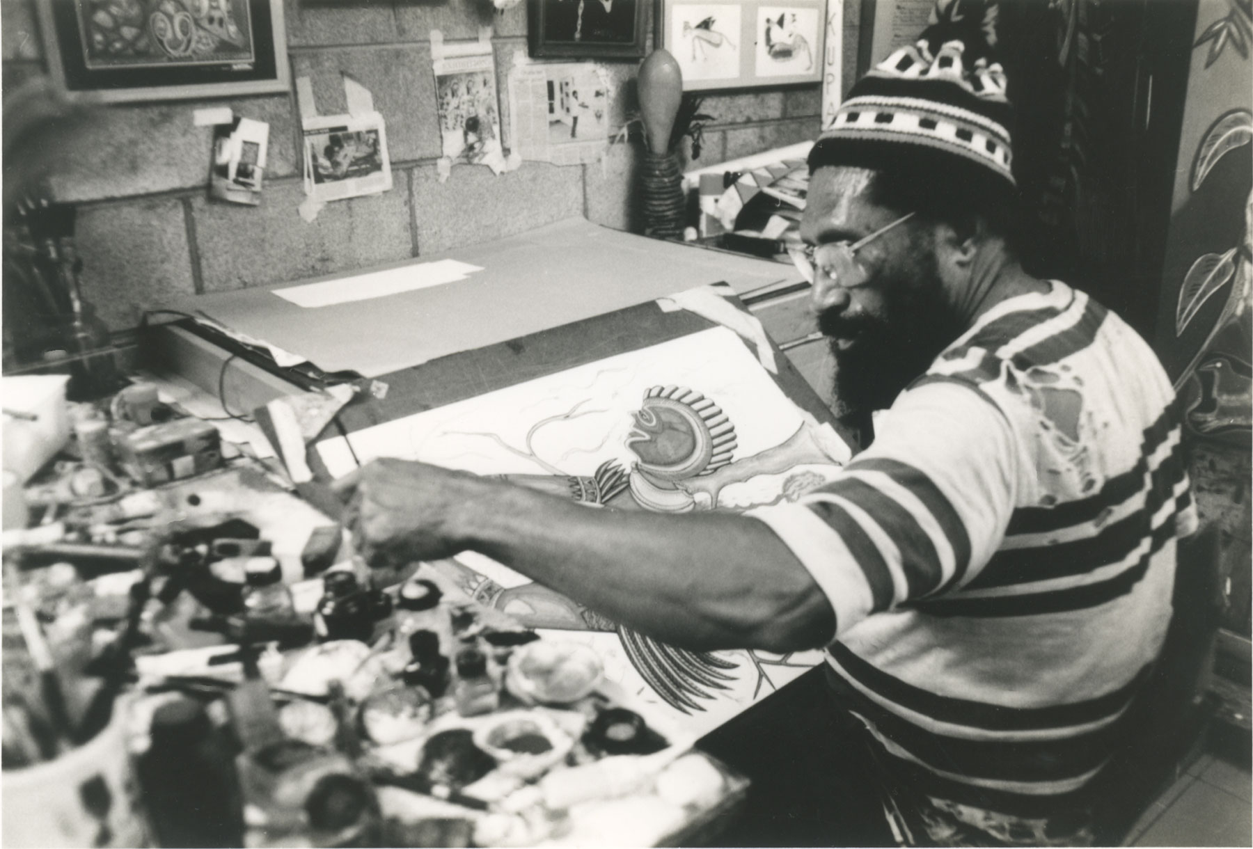 彼と絵画との出会いは、1968年。故郷をはなれ、さまざまな職業を経て、ゴロカの教員養成所の掃除夫になった時。そこで美術科の学生たちの描く絵に接し、いつしか自らも絵筆を握るようになったのである。